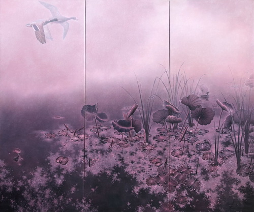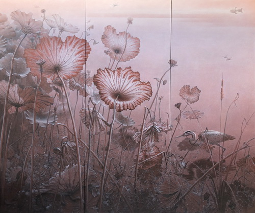 康有和早期以画荷出名,可能因名中带和(荷),让他痴迷于荷的画面及细节。尽管时光推移,他对荷的执着仍未改变。90后的康鹤鸣,从小接触很多动漫相关的信息,在他很多的作品中有生动的当代元素,这是他有别于父辈的成长经历。也是这样的不同让两人相互砥砺,也相互学习。康有和的绘画中对细节追求的DNA,同样也在康鹤鸣血液内。康鹤鸣在画面中的慎密线条,都是细心观察大自然后的产物。